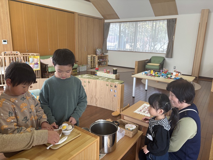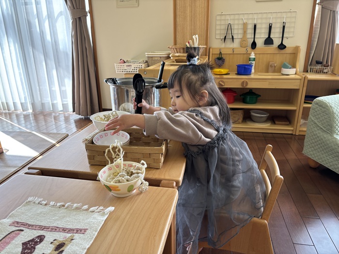 ラーメン屋さんのコーナーでは、お友達が上手にラーメンを作っています。