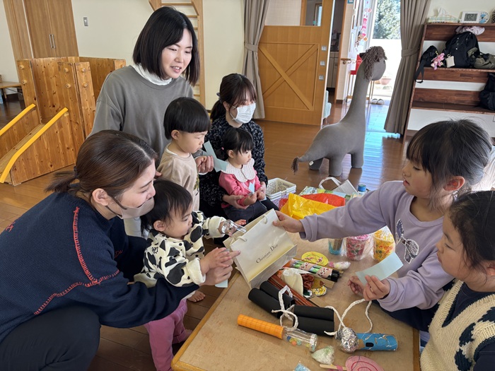 小さい子には音の出るおもちゃが人気ですね。他にも手作りのサンドイッチやスイーツ、5歳児さんの編み物の商品もありました。1つずつお家にお持ち帰りしていただきました。